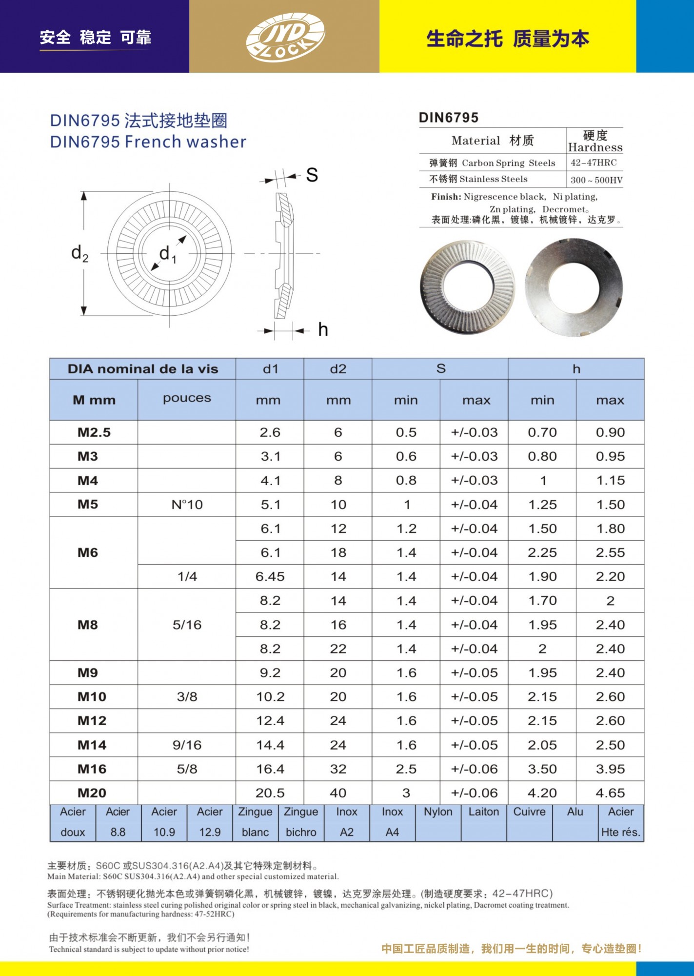 DIN6795是德國標(biāo)準(zhǔn)、該墊圈是一款法式鎖緊墊圈的改良設(shè)計產(chǎn)品、表面條紋有預(yù)緊防松作用。墊圈的背面設(shè)計有六個爪形剌破角!主要功能是在配合螺栓螺釘擰緊時可以剌破金屬基體表面!主要功能是剌破作用、因此也有人叫剌破墊圈、帶爪觸地墊圈!