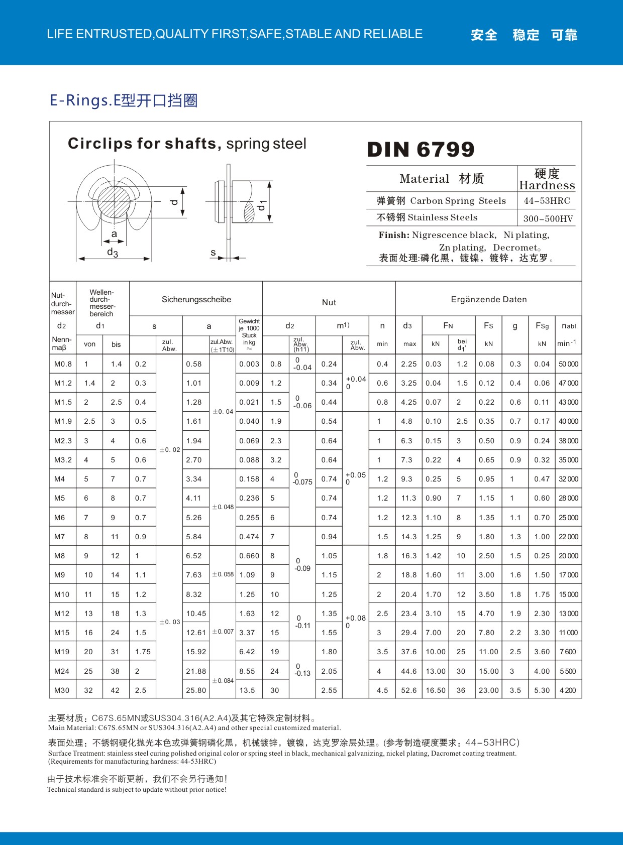 德國標準DIN6799開口擋圈,使用65MN,C67S彈簧鋼材質(zhì)及SUS304.SUS316/EN1.4301.EN1.4401不銹鋼材質(zhì),硬化質(zhì)量穩(wěn)定,回彈性好!彈簧鋼表面磷化黑,機械鋅等!鹽霧可達500H以上,保證無氫脆斷裂!瑞士模具制造設備,可生產(chǎn)0.8微精密開口擋圈,史特牢公司級進模具生產(chǎn)高效率低成本!