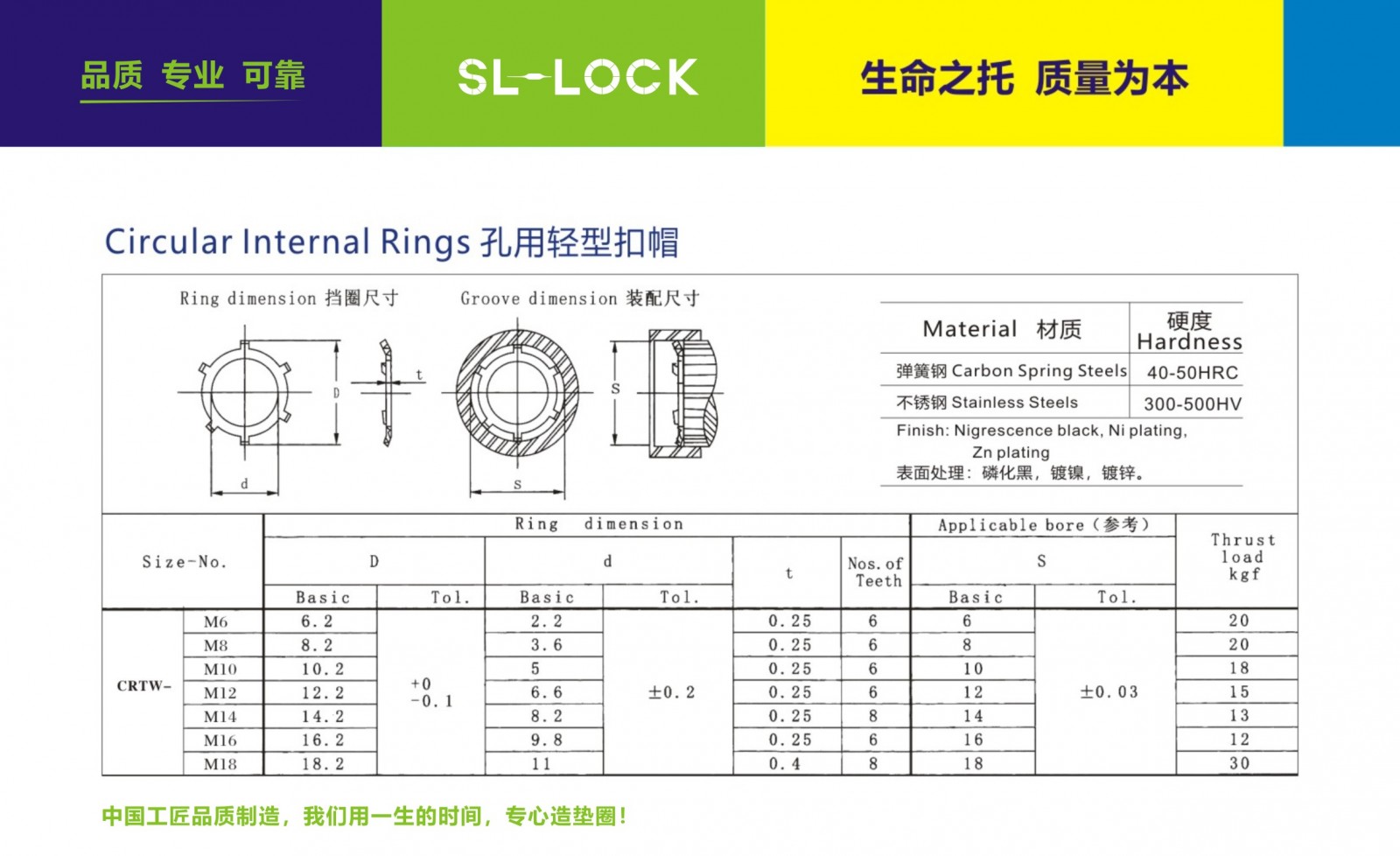 名稱:輕型孔用止動(dòng)墊圈 執(zhí)行標(biāo)準(zhǔn):CRTW 型號(hào):M6-M18 材質(zhì):SUS301/SUS304/SUS316 表面處理:硬化拋光